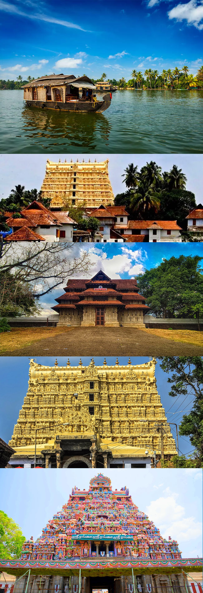 It is believed that Parasurama, an avatar of Vishnu threw his battle ax into the sea after he reached Gokuram from Kanyakumari, and as a result, the land of Kerala arose, reclaimed from the waters. Puranas say that it was Parasuram who planted the 64 Brahmin families in Kerala, whom he brought down from the north in order to expiate his slaughter of the Kshatriyas. Kerala is also known as Parasurama Kshetram, 'The Land of Parasurama'. Kerala has a number of pilgrimage places and famous pilgrim centers consisting of ancient temples and shrines. Sabarimala is considered the worship place where the maximum number of devotees come in a year. Thiruvananthapuram, the capital city of Kerala, is known as the city of temples.There are hundreds of sacred temples in Thiruvananthapuram alone along with arguably the richest temple in the world, Sree Padmanabha Swami Temple. Guruvayoor the world-renowned Sree Krishna Temple has its roots in Satya Yuga. Vadakkunnathan, Aranmula, and Vaikkam are also very old temples with amazing architectural features. In Kerala, temple arts have evolved in such a way that the whole world comes to enjoy them here. Another specialty of Kerala is the presence of domesticated elephants. Elephants have a special place in the hearts of the people of Kerala and they play an important role in religious ceremonies at the temples and other sacred places of Kerala. Kaviyoor Mahadeva, Mammiyoor, Attukal Bhagavathy, Chottanikara Devi, Mannarasala Nagaraja, Thiruvanchikulam, Lokanarkavu, Parassinikadavu Muthappan, Thirunelli, Aranmula Parthasarathy, Rajarajeshwara are some of the must-visit temples in Kerala. Guruvayoor the world-renowned Sree Krishna Temple has its roots in Satya Yuga. Vadakkunnathan, Aranmula, and Vaikkam are also very old temples with amazing architectural features. In Kerala, temple arts have evolved in such a way that the whole world comes to enjoy them here. Another specialty of Kerala is the presence of domesticated elephants. Elephants have a special place in the hearts of the people of Kerala and they play an important role in religious ceremonies at the temples and other sacred places of Kerala. Kaviyoor Mahadeva, Mammiyoor, Attukal Bhagavathy, Chottanikara Devi, Mannarasala Nagaraja, Thiruvanchikulam, Lokanarkavu, Parassinikadavu Muthappan, Thirunelli, Aranmula Parthasarathy, Rajarajeshwara are some of the must-visit temples in Kerala. Guruvayoor the world-renowned Sree Krishna Temple has its roots in Satya Yuga. Vadakkunnathan, Aranmula, and Vaikkam are also very old temples with amazing architectural features. In Kerala, temple arts have evolved in such a way that the whole world comes to enjoy them here. Another specialty of Kerala is the presence of domesticated elephants. Elephants have a special place in the hearts of the people of Kerala and they play an important role in religious ceremonies at the temples and other sacred places of Kerala. Kaviyoor Mahadeva, Mammiyoor, Attukal Bhagavathy, Chottanikara Devi, Mannarasala Nagaraja, Thiruvanchikulam, Lokanarkavu, Parassinikadavu Muthappan, Thirunelli, Aranmula Parthasarathy, Rajarajeshwara are some of the must-visit temples in Kerala. and Vaikkam are also very old temples with amazing architectural features. In Kerala, temple arts have evolved in such a way that the whole world comes to enjoy them here. Another specialty of Kerala is the presence of domesticated elephants. Elephants have a special place in the hearts of the people of Kerala and they play an important role in religious ceremonies at the temples and other sacred places of Kerala. Kaviyoor Mahadeva, Mammiyoor, Attukal Bhagavathy, Chottanikara Devi, Mannarasala Nagaraja, Thiruvanchikulam, Lokanarkavu, Parassinikadavu Muthappan, Thirunelli, Aranmula Parthasarathy, Rajarajeshwara are some of the must-visit temples in Kerala. and Vaikkam are also very old temples with amazing architectural features. In Kerala, temple arts have evolved in such a way that the whole world comes to enjoy them here. Another specialty of Kerala is the presence of domesticated elephants. Elephants have a special place in the hearts of the people of Kerala and they play an important role in religious ceremonies at the temples and other sacred places of Kerala. Kaviyoor Mahadeva, Mammiyoor, Attukal Bhagavathy, Chottanikara Devi, Mannarasala Nagaraja, Thiruvanchikulam, Lokanarkavu, Parassinikadavu Muthappan, Thirunelli, Aranmula Parthasarathy, Rajarajeshwara are some of the must-visit temples in Kerala. Another specialty of Kerala is the presence of domesticated elephants. Elephants have a special place in the hearts of the people of Kerala and they play an important role in religious ceremonies at the temples and other sacred places of Kerala. Kaviyoor Mahadeva, Mammiyoor, Attukal Bhagavathy, Chottanikara Devi, Mannarasala Nagaraja, Thiruvanchikulam, Lokanarkavu, Parassinikadavu Muthappan, Thirunelli, Aranmula Parthasarathy, Rajarajeshwara are some of the must-visit temples in Kerala. Another specialty of Kerala is the presence of domesticated elephants. Elephants have a special place in the hearts of the people of Kerala and they play an important role in religious ceremonies at the temples and other sacred places of Kerala. Kaviyoor Mahadeva, Mammiyoor, Attukal Bhagavathy, Chottanikara Devi, Mannarasala Nagaraja, Thiruvanchikulam, Lokanarkavu, Parassinikadavu Muthappan, Thirunelli, Aranmula Parthasarathy, Rajarajeshwara are some of the must-visit temples in Kerala.